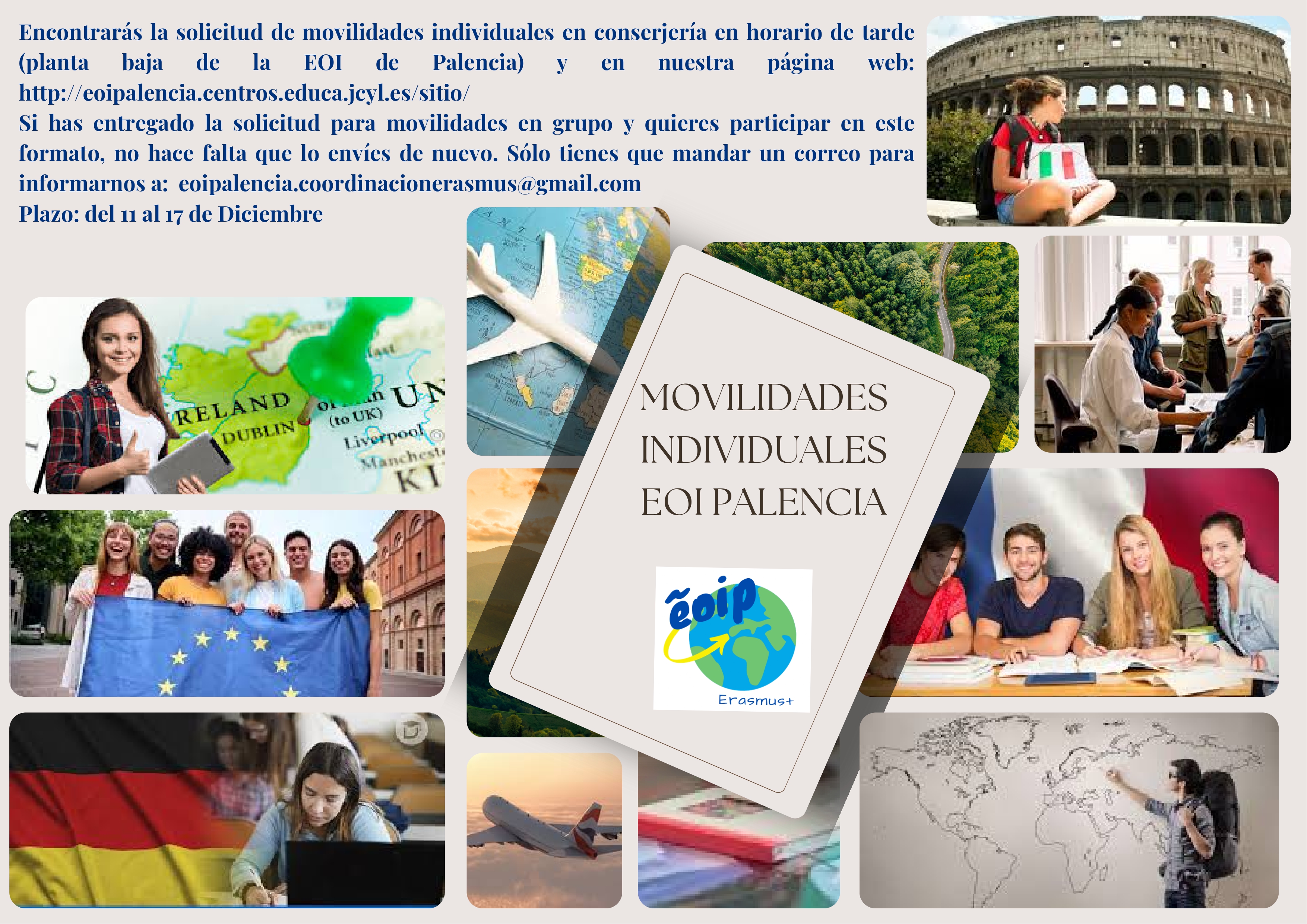 Encontrarás la solicitud de movilidades individuales en conserjería en horario de tarde (planta baja de la EOI de Palencia) y en nuestra página web: http://eoipalencia.centros.educa.jcyl.es/sitio/ Si has entregado la solicitud para movilidades en grupo y quieres participar en este formato, no hace falta que lo envíes de nuevo. Sólo tienes que mandar un correo para informarnos a: eoipalencia.coordinacionerasmus@gmail.com Plazo: del 11 al 18 de Diciembre